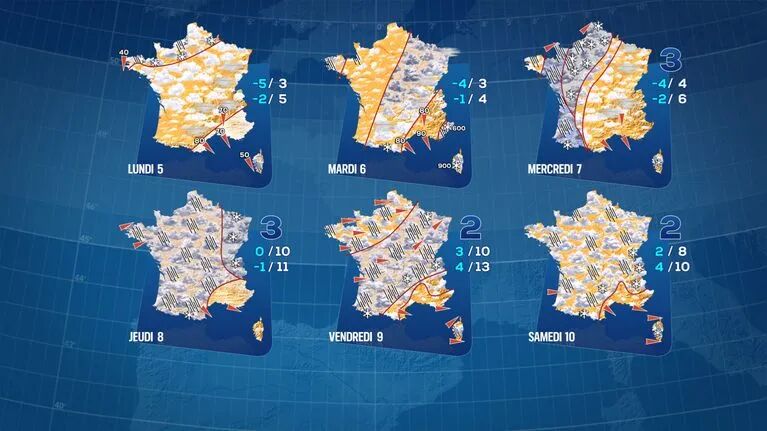 到了1月8日(周四),法国西部会先暖起来,气温回升到11–14°C,但雨水上线,湿冷依旧。