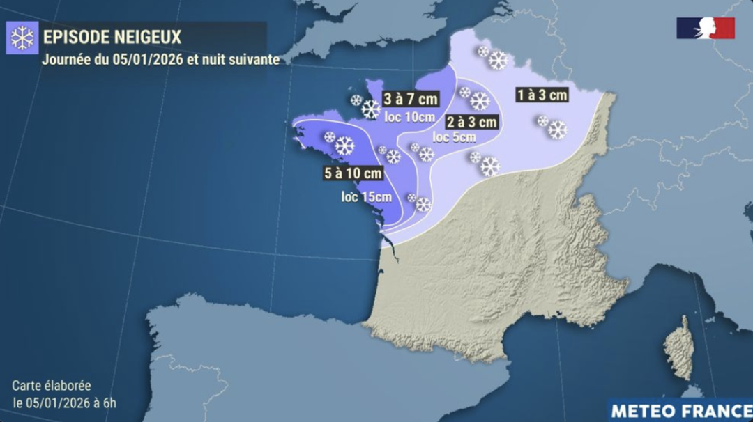 周一上午,降雪主要集中在 Bretagne — Normandie 一线;下午开始向 Pays de la Loire 和 Bassin parisien 推进,夜间将进一步波及Poitou-Charentes