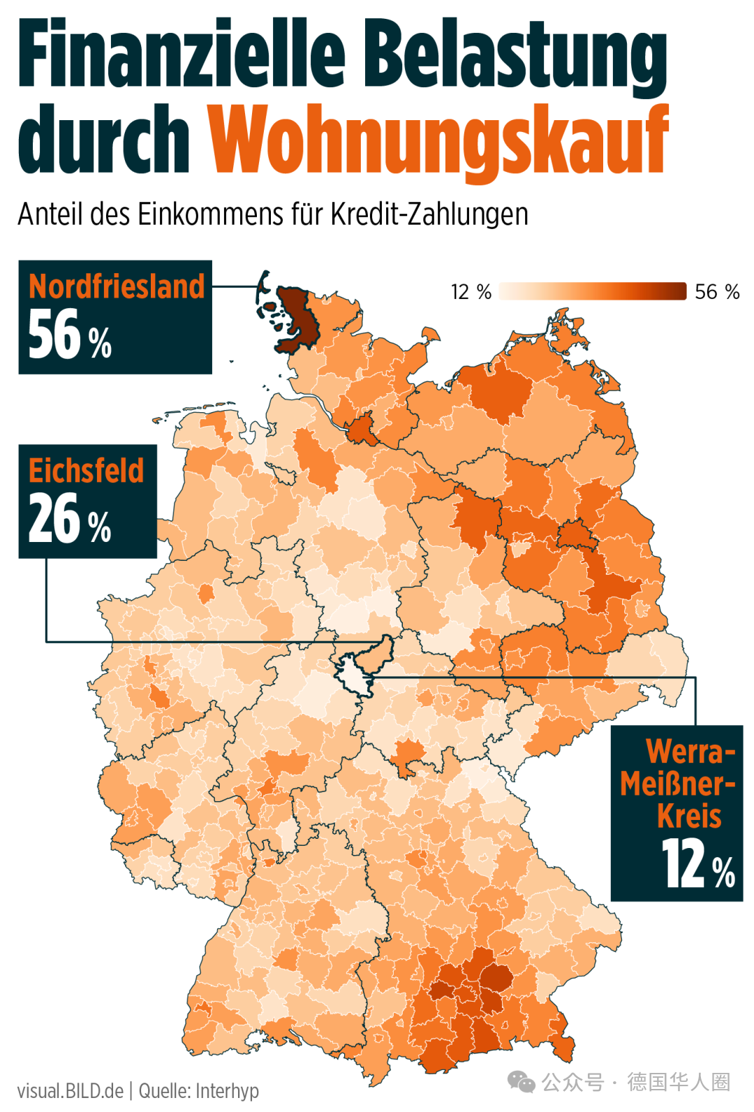 不过买房难不难,很大程度上看你在哪买。根据这份Interhyp-IW指数,除了主要都市区,德国大部分家庭的月供占比都低于35%的及格线。在城市周边和中小城镇,这个比例通常在25%到31%之间,压力相对可控。