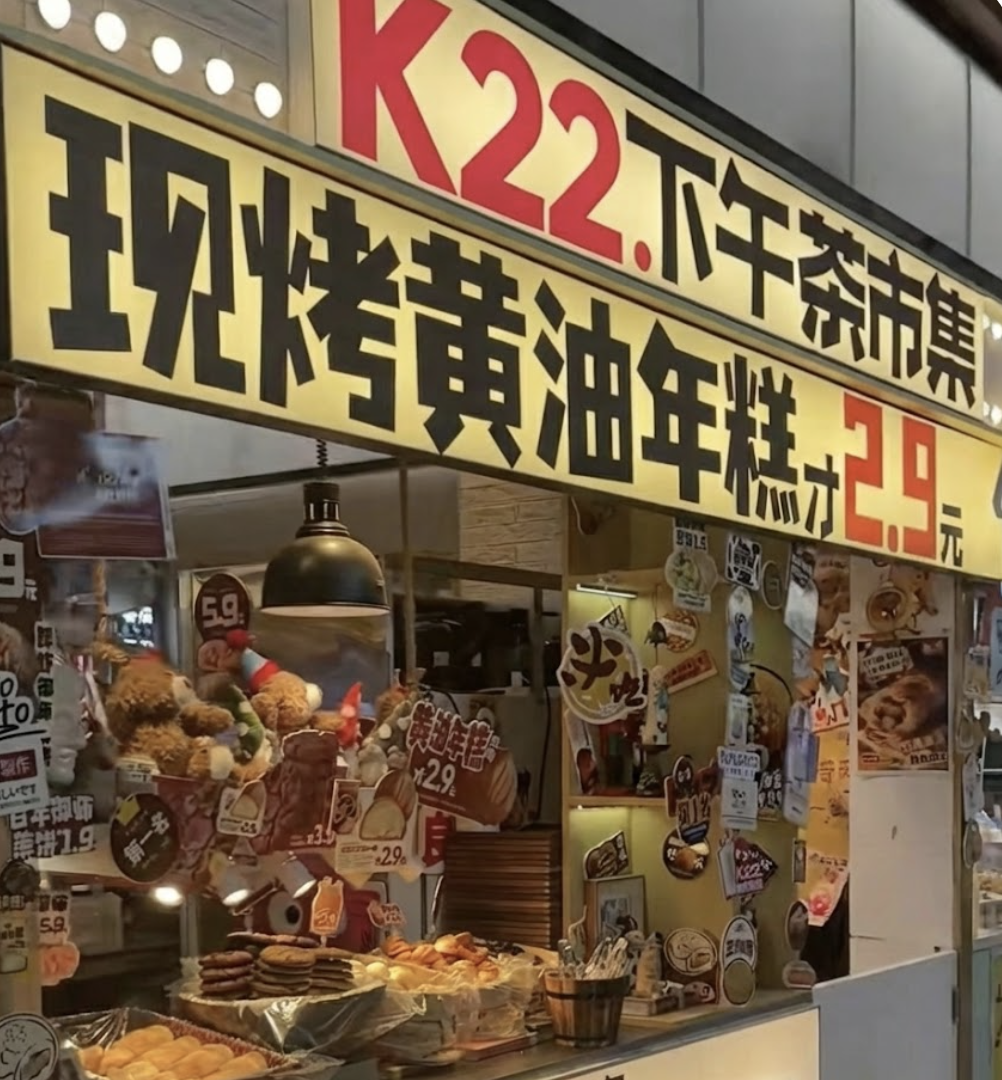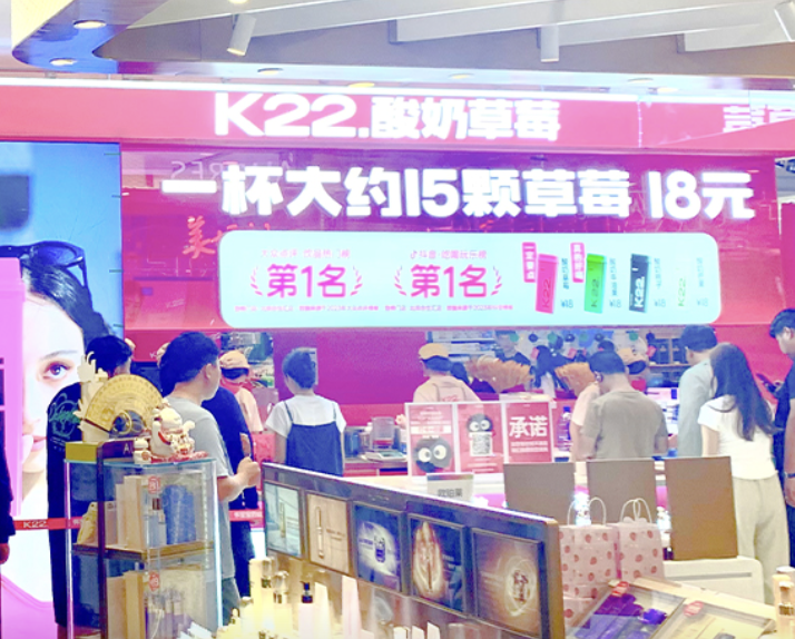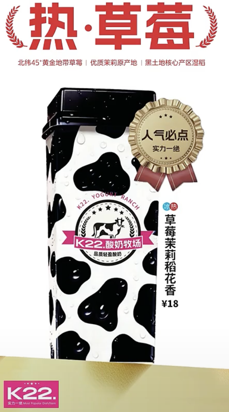 当年人称“商场排队王”的K22,靠着“电光芭比粉”的装潢吸引年轻人,并在广告语上直接对标茉酸奶: