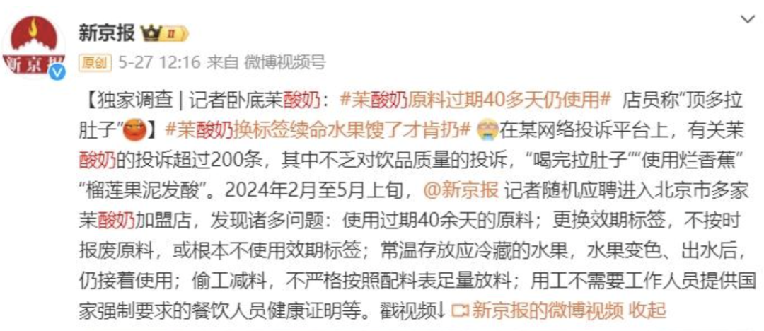 一杯定价三四十的茉酸奶芒果奶昔被消保委点名“脂肪含量过高”,被媒体曝出原料过期40天还在用,水果馊了才扔。