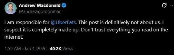 “我负责@UberEats,这篇帖子说的绝对不是我们。我怀疑它是编造的,网上看到的东西,不要什么都信。”