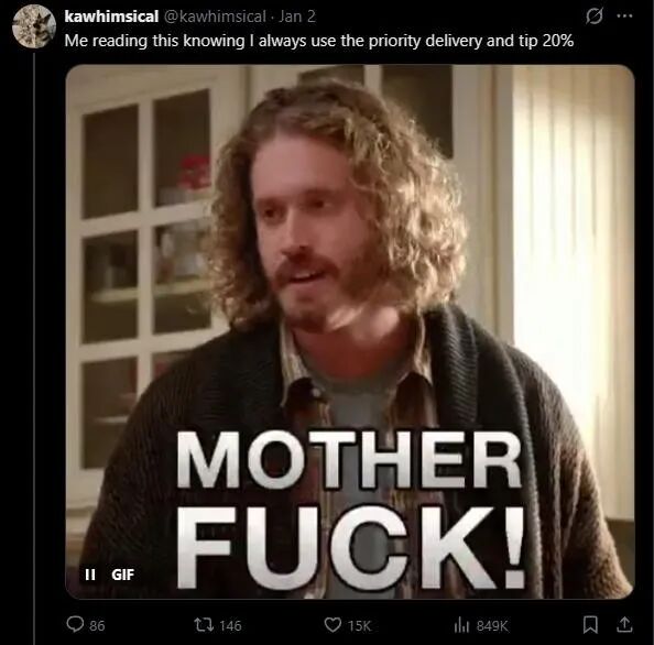 “一直使用‘优先配送’,还总是给20%小费的我be like:”