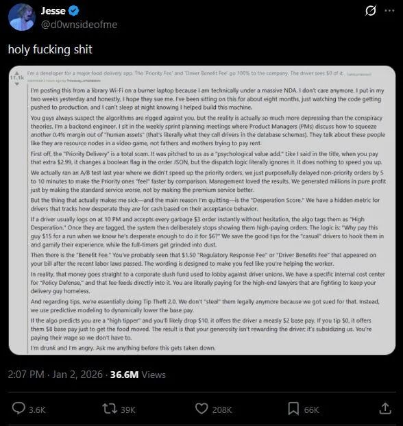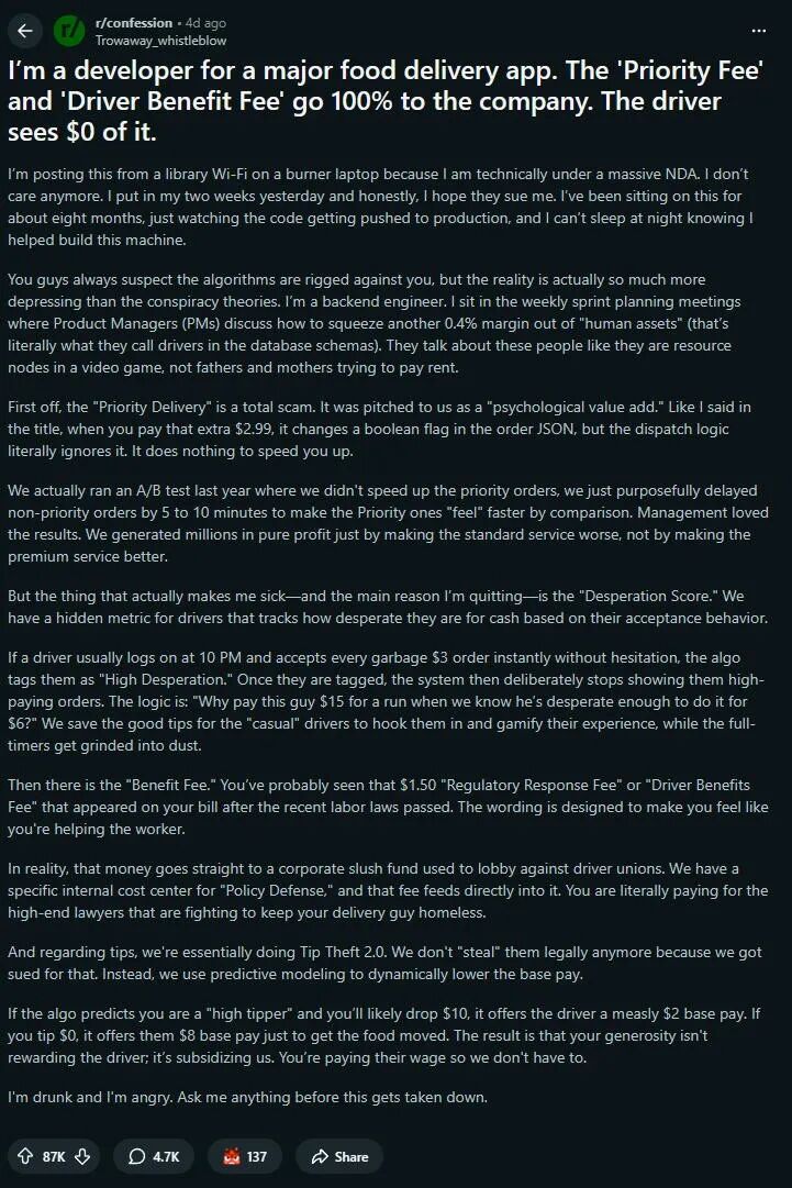 “你们总是怀疑算法在暗中操纵你们,但真相比那更为黑暗。我是一名后端工程师,每周都要参加会议,产品经理们在会上大谈如何在‘人力资产’身上多榨出0.4%的利润。”