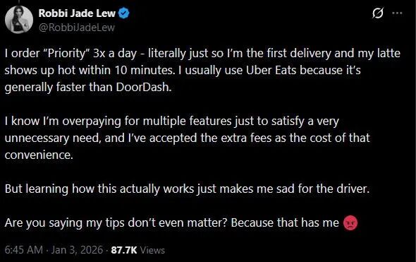 “首先,所谓的‘优先配送’完全是个骗局,心理作用罢了。你额外付的那2.99美元,在后台只是变了一个标志,但配送逻辑完全是一样的,它对加快配送速度没有任何作用。”