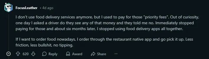 “我立刻就再也不花这冤枉钱了,大约6个月后,我连外卖APP都彻底不用了。现在我想点餐,会直接用餐厅的官方APP下单,然后自己去取。更方便,更省事,还不用给小费。”