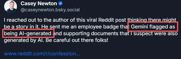 记者Casey Newton做了进一步验证——谷歌Gemini说,它是AI生成的。