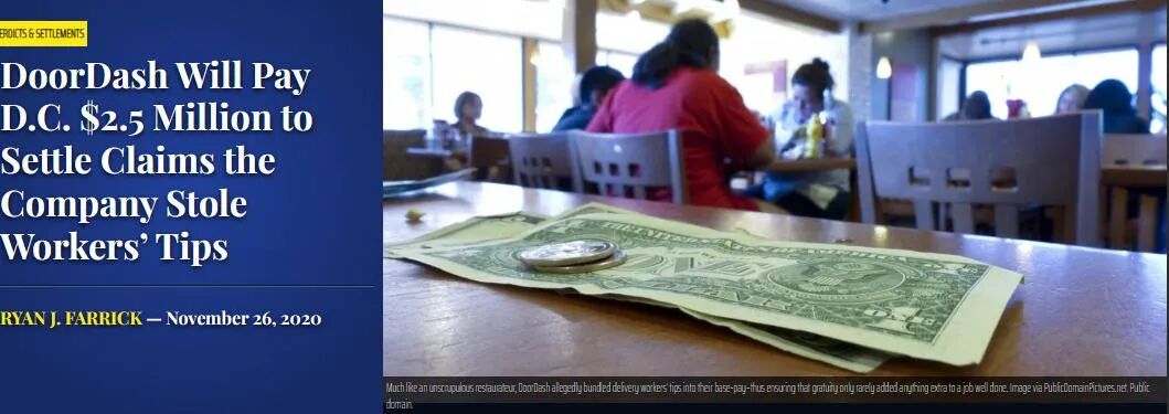 2019年,DoorDash曾被消费者和外卖员集体诉讼。大概过程是一名用户指控DoorDash欺诈消费者,误导用户认为小费会直接给司机,但实际被DoorDash挪用,补贴成本。
