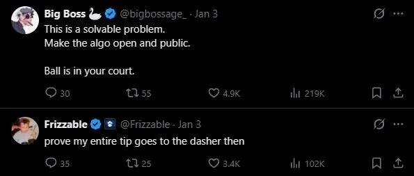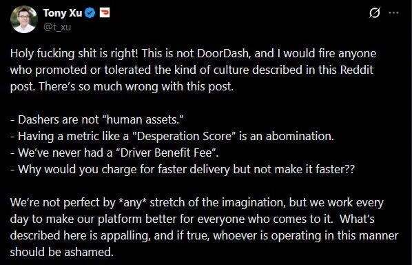 舆情爆炸之后,DoorDash的创始人徐迅(Tony Xu,美籍华人)迅速在推特上澄清说,帖子里提到的绝对不是DoorDash: