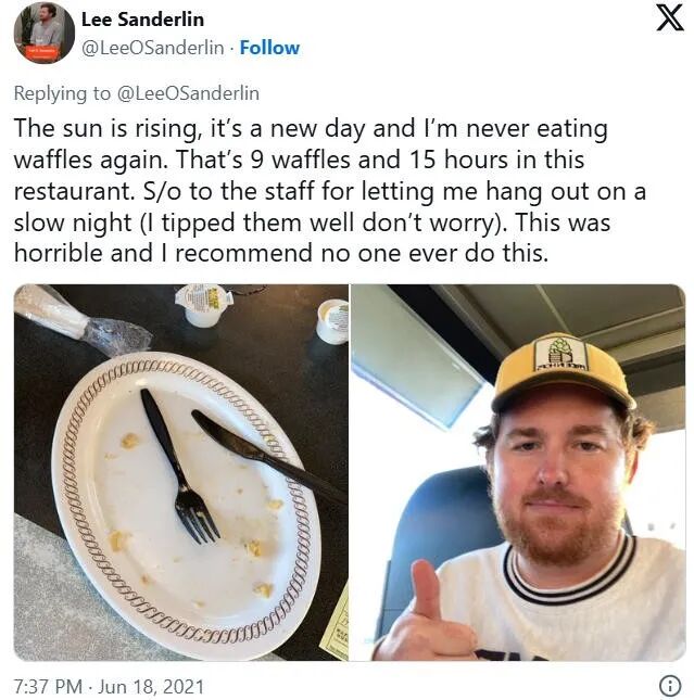 在连锁快餐店华夫饼屋待24个小时,每吃掉一个华夫饼,就能减少一个小时,同时在X上实时播报。