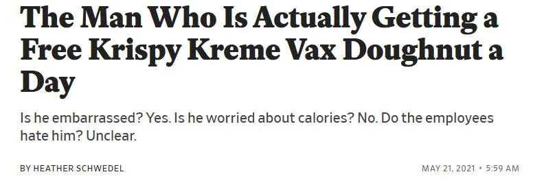 Krispy Kreme宣布免费甜甜圈活动后,正赶上他接种第二针疫苗,天时地利,于是顺理成章地开始了免费品尝,只要给店员看一下疫苗接种卡,每天都能拿到一个免费甜甜圈。