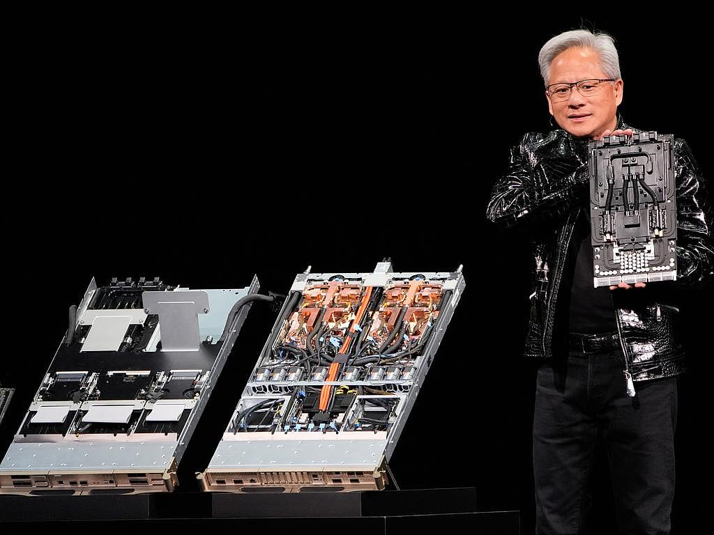 英伟达(Nvidia)创始人兼首席执行官黄仁勋(Jensen Huang)在新闻发布会上介绍 NVIDIA Rubin AI 超级计算平台。图片:AP Photo/John Locher