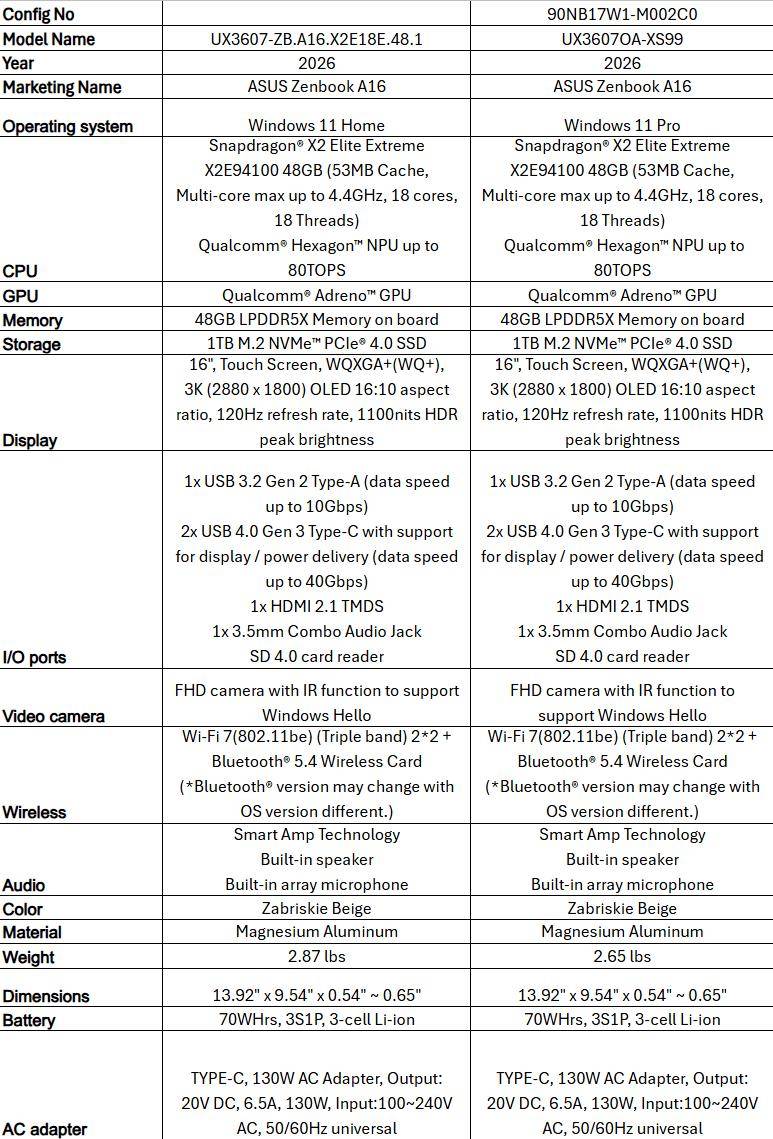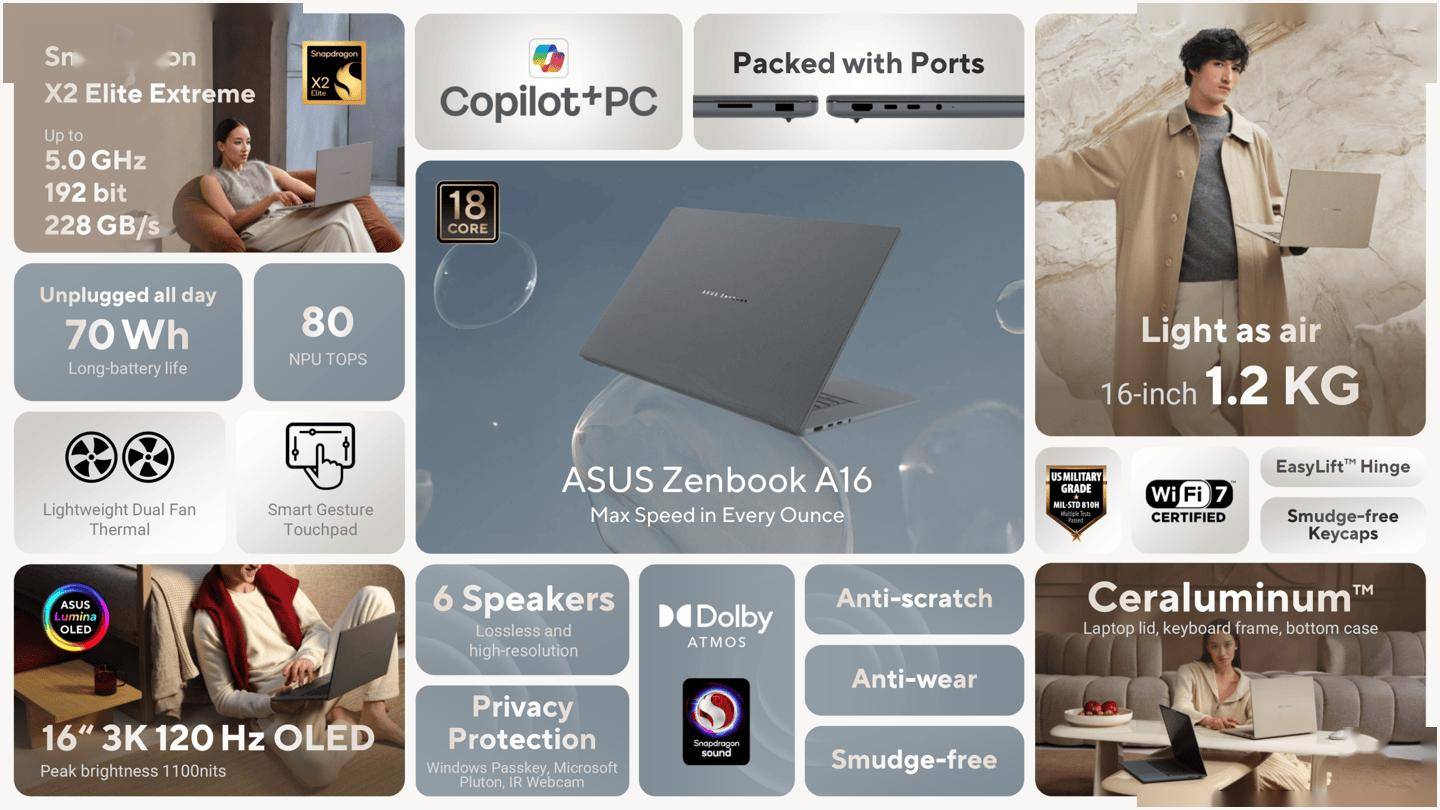 IT之家 1 月 7 日消息,科技媒体 Wccftech 今天(1 月 7 日)发布博文,报道称在 CES 2026 展会期间,华硕推出 Zenbook A16(UX3607),声称是迄今为止“速度最快、性能最强”的骁龙笔记本电脑。