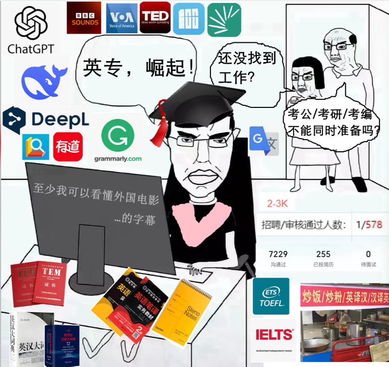 诚然,英专的出路是不少,但问题是这些路基本都不是独家通道,更像是全员开放的自助餐:你端着盘子冲进餐厅,一眼瞄到法学、商科、计算机也在你的锅里夹菜,“英语不错的非英专”还冲上来要抢你盘子。