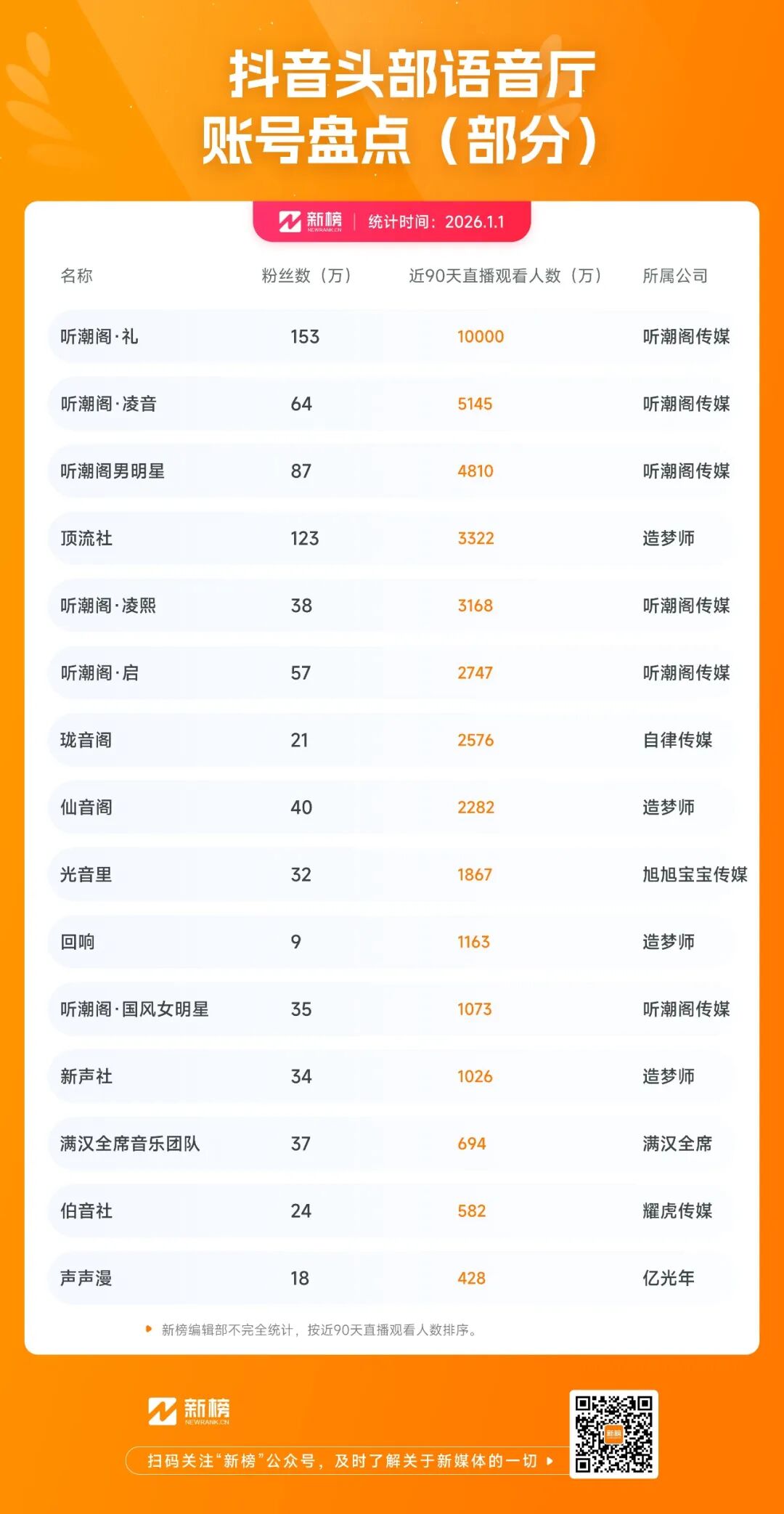 现如今,业内不仅有YY语音、TT语音、Soul等多个以语音为核心的社交平台,还出现了听潮阁传媒、造梦师、自律传媒、旭旭宝宝传媒等多个语音厅公会。头部语音厅公会听潮阁传媒告诉新榜编辑部,目前听潮阁传媒员工接近1000人,签约虚拟歌手超过5000人,孵化了“听潮阁男明星”“听潮阁·礼”等13个人气语音厅。