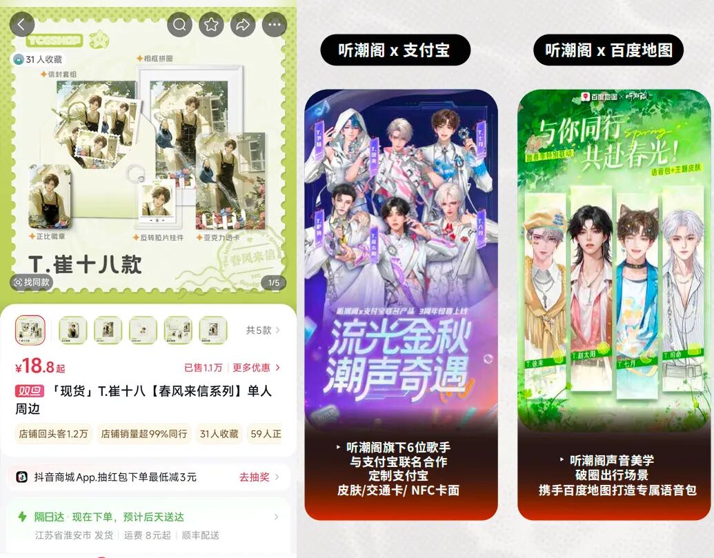 以听潮阁传媒为例,除直播收入外,听潮阁传媒还开发了品牌商务、线下演出、IP衍生品售卖、音乐版权等多元变现方式。截至目前,听潮阁传媒旗下主播已经与溪木源、嘉利玛、支付宝等多个品牌达成合作;仅在抖音单一渠道,“𝑇.崔十八¹⁸”的一款价格18.8元的周边产品就卖出1.1万多件,累计GMV超20.6万元。