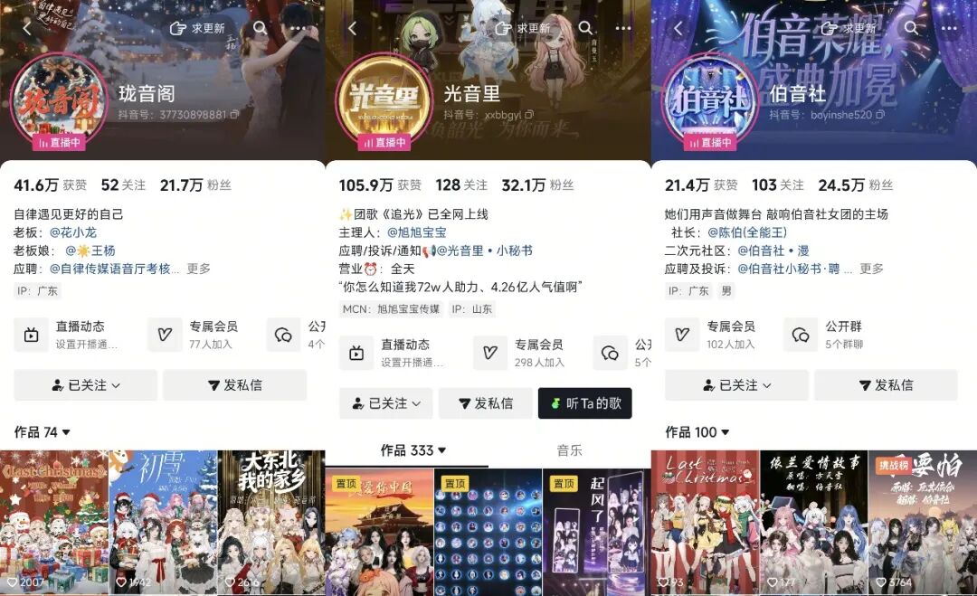 UU提到,听潮阁传媒的定位是一家音乐类经纪公司,而非单纯的语音厅公会,并逐渐摸索打通了“语音厅-虚拟直播-线下演出-主流舞台”的完整链路。