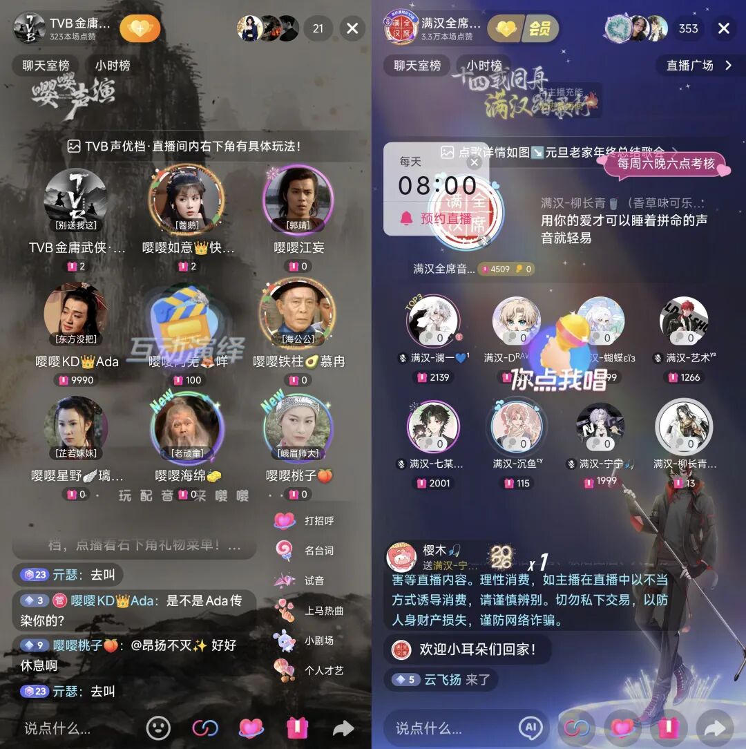 才艺厅以展示主播才艺为主,最近部分声优就在抖音组成了“TVB金庸武侠·嘤嘤嘤十五厅”,在直播间“复活”TVB版金庸武侠剧中的经典角色。但最主流、商业变现最成功的才艺厅是点唱厅,基本玩法是用户花钱点歌,主播上麦唱歌,包括“𝑇.赵太阳”“𝑇.崔十八¹⁸”“控”“DL.羊”等顶流语音主播都出自点唱厅。