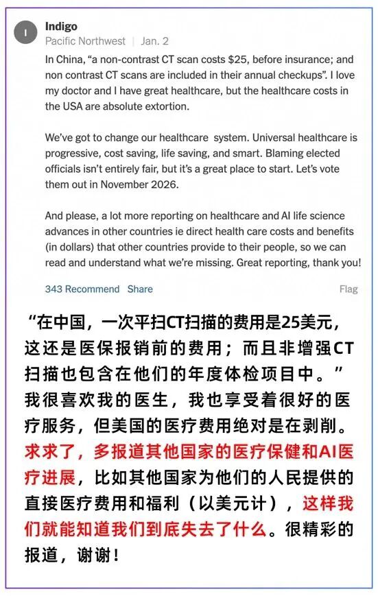 还有一位用户在评论区跪求,让《纽约时报》多多报道其他国家医疗保健和AI生命科学进展,三句话不离反思美国体制,也没见他游过太平洋啊。
