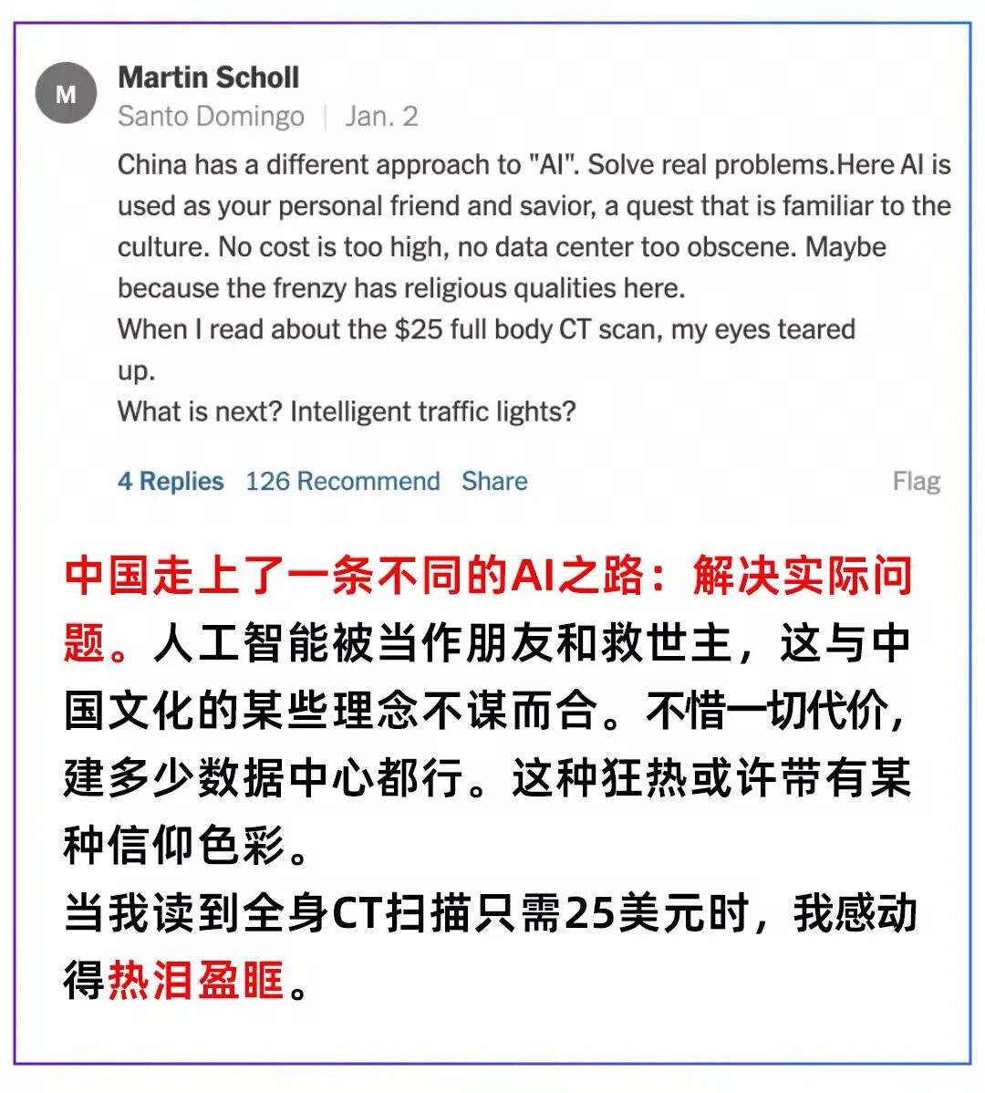 看到一篇报道中国医疗AI最新进展的新闻,他们就开始原地反思,说中国的AI多好多厉害,说中国的医疗体制多人性多便宜,话里话外充斥着“美国人应该反思,美国体制不行,赶紧向中国学习”。