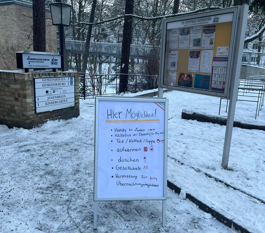 比如,在泽伦多夫的艾玛斯路德教堂,沉重的木门在寒风中不断被推开。教堂的帕斯托雷·卡塔琳娜(Katharina Freymuth-Loh)牧师早早地把供暖开到了最大,这里变成了一个24小时的避风港。