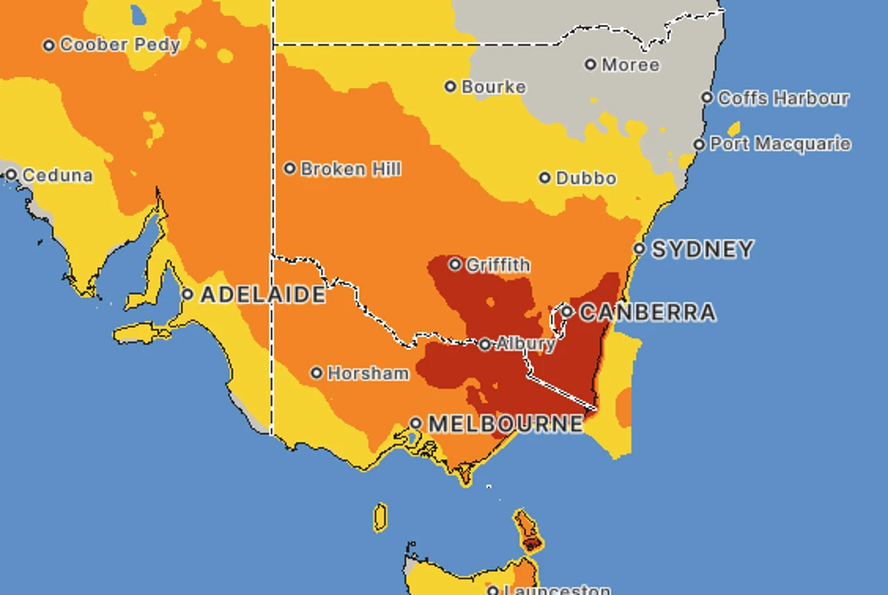 周五的热力图显示,新州和维州大片地区将遭受极端高温。图:BOM