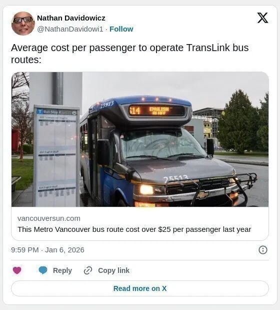 根据温哥华太阳报的报道,这些高成本线路几乎都在郊区:拉德纳、Tsawwassen、枫树岭、Lions Bay……平均每名乘客成本在 16–28 加元,远高于全区平均的 6 加元。