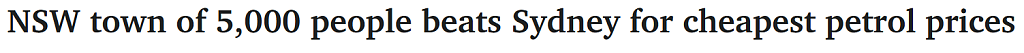 “Oberon的人口比悉尼少1000倍,但居民支付的普通无铅汽油平均价格却比澳洲最大城市低16澳分/升——这对竞争激烈的Oberon来说是个好消息,对悉尼的价格周期来说则是个坏消息。”
