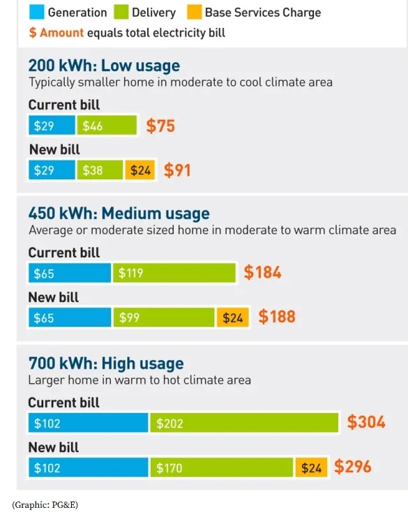 此次调整可能会导致部分用户账单上涨。PG&E公布的图表显示,账单变化主要取决于用电量。低用量用户约为200千瓦时、中等用量用户约为450千瓦时,其总账单预计将小幅上涨。只有高用电量用户(约为700千瓦时)才可能享受更低的账单,该类用户通常住在气候温暖至炎热地区的大型住宅。