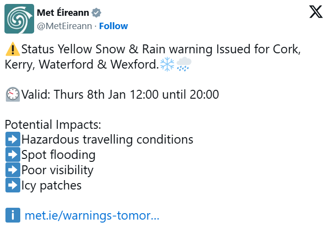 风暴“戈雷蒂”预计将于明日侵袭爱尔兰,为南部多个郡带来强降雪与暴雨天气。该风暴已由法国气象局命名,此前已在欧洲多地造成大规模交通中断,并导致巴黎、阿姆斯特丹数百架航班取消。爱尔兰气象局已对科克、凯里、沃特福德及韦克斯福德发布黄色天气预警,预计降雨将自明日中午12时持续至晚间8时,部分地区雨势强劲并可能转为雨夹雪或降雪,高海拔地区可能出现积雪。气象部门警告,相关地区将面临危险出行条件、局部洪水、能见度降低及路面结冰风险。昨日,N22麦克鲁姆绕道路段就曾因结冰引发多起碰撞事故而暂时关闭。此外,北爱尔兰安特里姆、阿马、唐、弗马纳、蒂龙及德里等郡也将自午夜至明日早10点处于黄色结冰预警状态,英国气象局提示未经处理路面将形成冰层,可能引发交通中断。