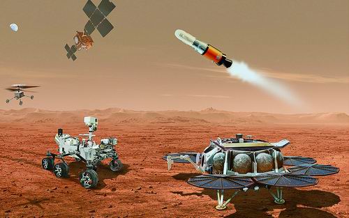 在从火星运回岩石样本任务中发挥重要作用的航天器艺术图。