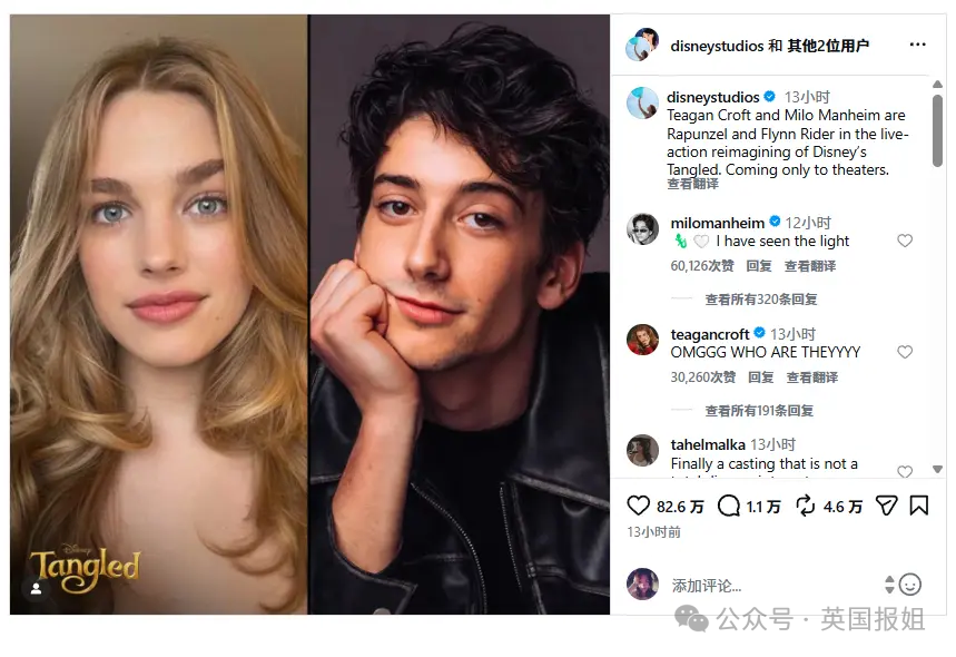 迪士尼:蒂根·克罗夫特与米洛·曼海姆,将在迪士尼动画《魔发奇缘》的真人版电影中,分别饰演乐佩公主和费林·雷德。