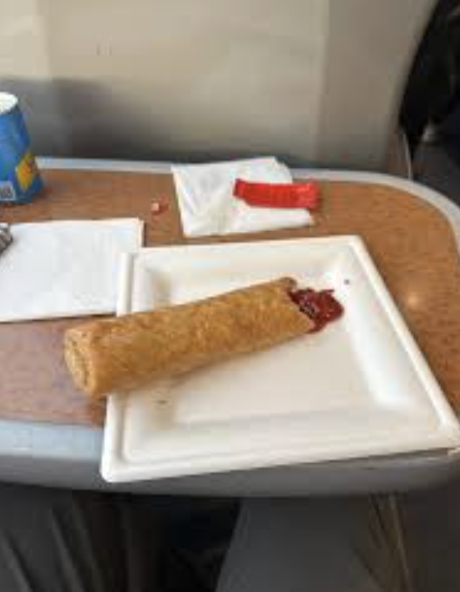 几分钟后,一名一等座的服务人员端着盘子,从厨房里走了出来。盘子里的内容,让人瞬间产生了一种不合时宜的熟悉感——香肠卷。