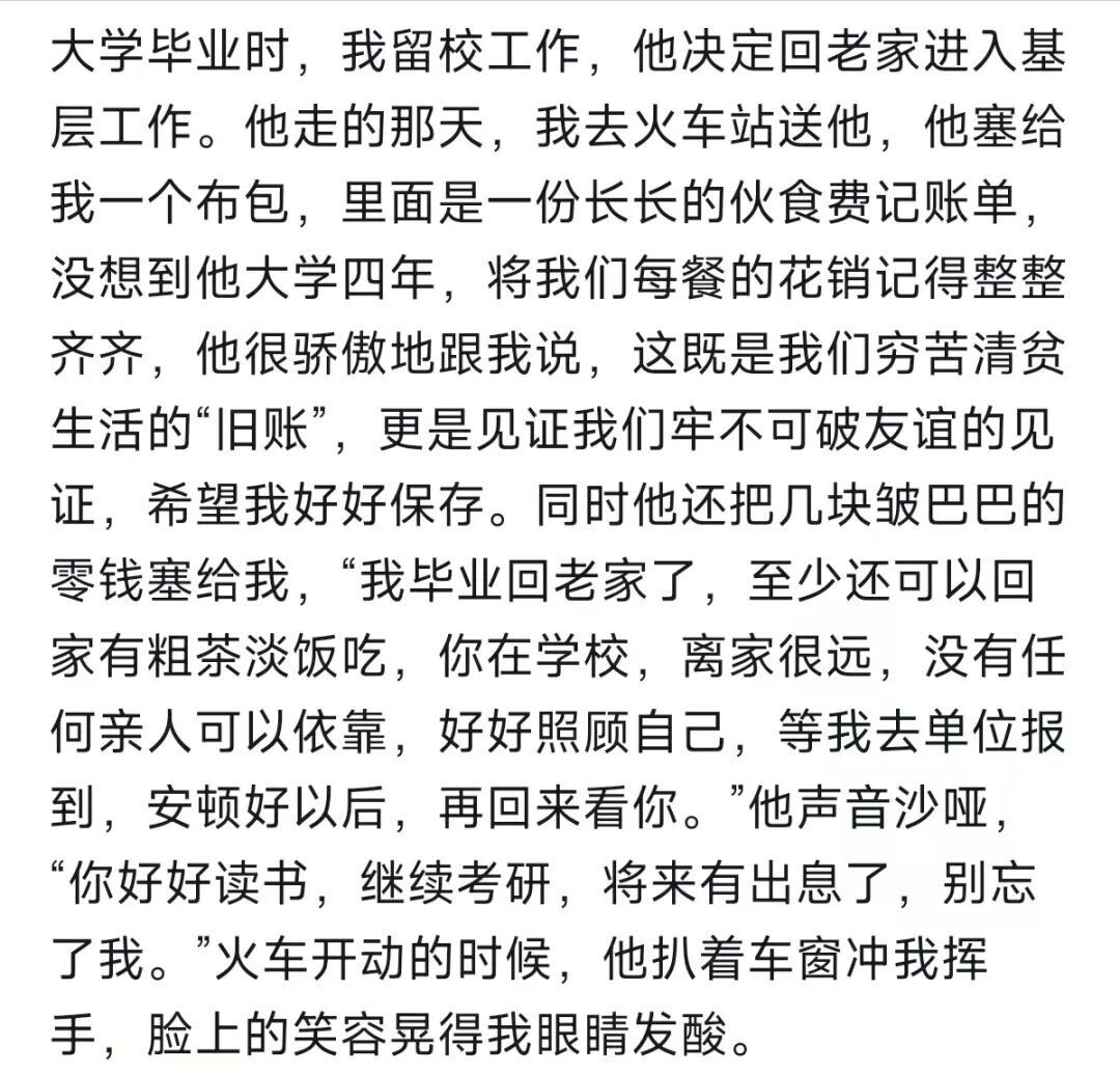 文字里没有一句“我们感情深厚”,却满是生活碾过的辙痕:一盏走廊路灯下共同备考的剪影,一份珍藏多年、写满清贫与珍贵的伙食费旧账。