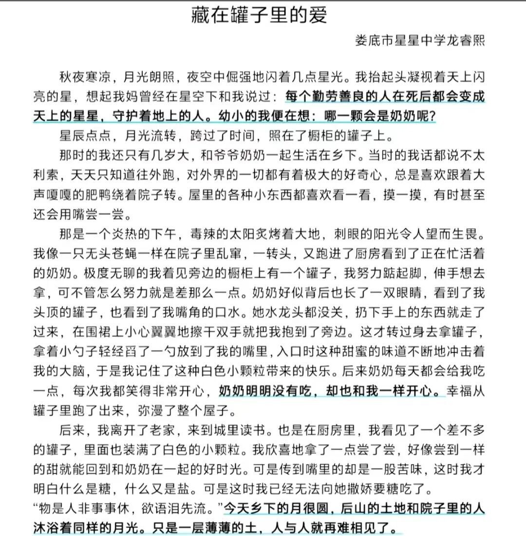 中学生龙睿熙的短文《藏在罐子里的爱》,写的看似是一只罐子,其实是奶奶对他的爱。