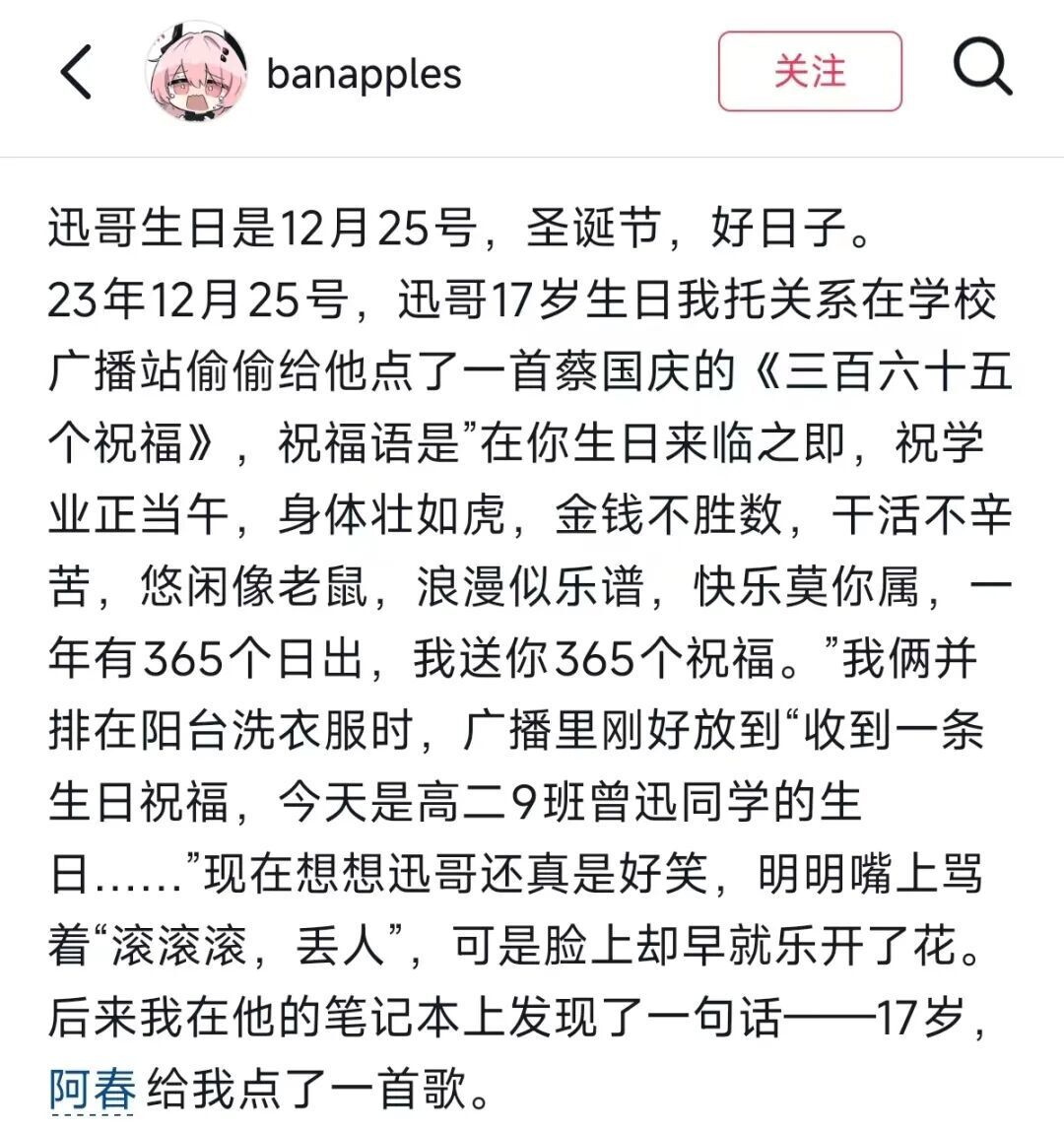 他写迅哥“长得黑黑的,瘦瘦高高的,倒霉了一辈子”,写他们一起打游戏、传纸条,写自己为迅哥17岁生日在校园广播点歌。