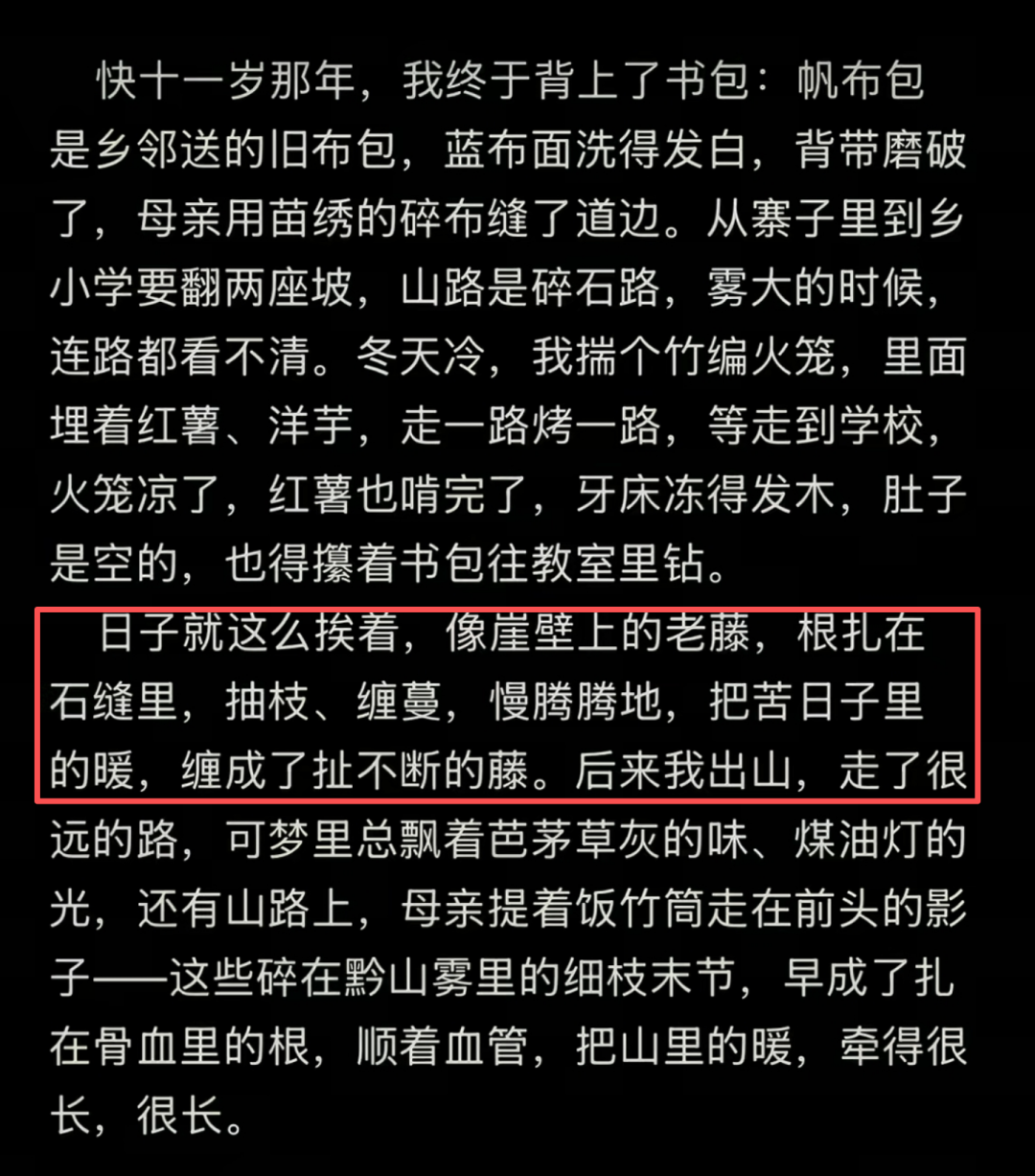 在贵州大山里长大的祝薪雁阿姨,写下童年的记忆:“日子就这么挨着,像崖壁上的老藤,根扎在石缝里……把苦日子里的暖,缠成了扯不断的藤。”