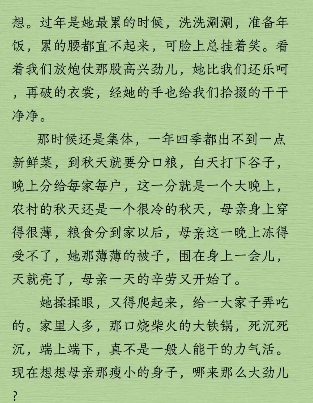 有人写母亲。锅铲、煤油灯、缝补的动作,一样一样写下来,母亲就活在这些细节里。