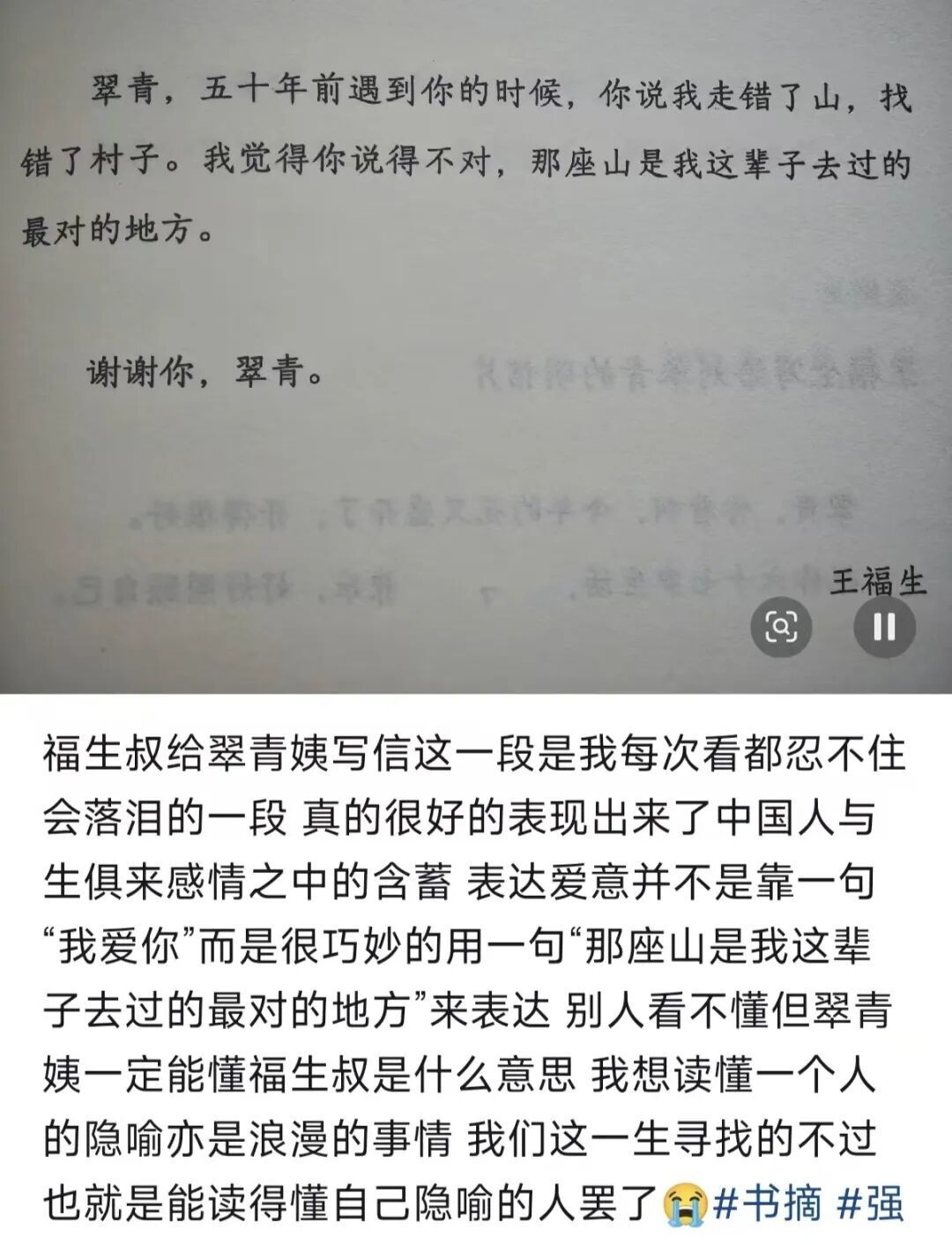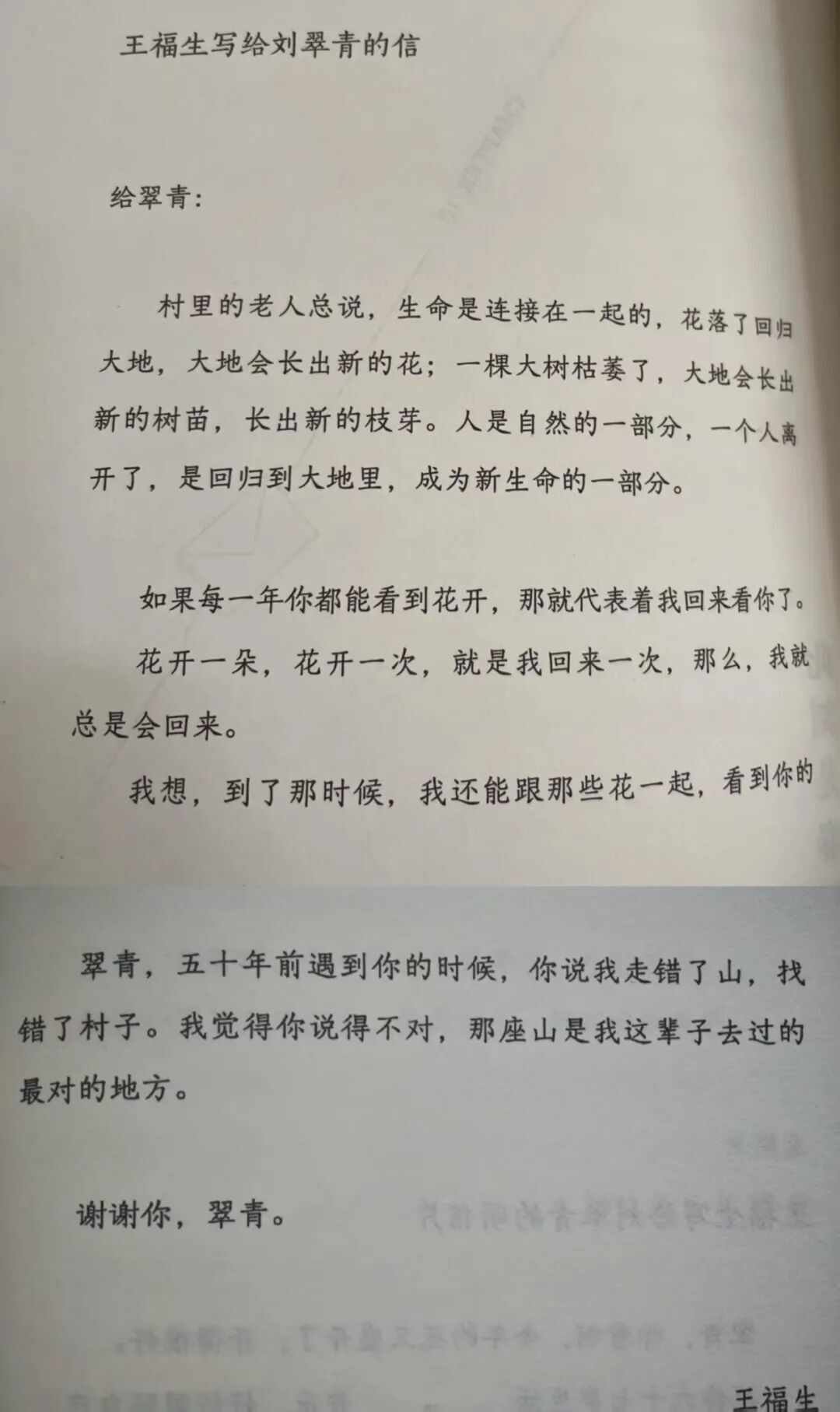 它是一封从天国寄往人间的信,开头便是:“翠青,五十年前遇到你的时候,你说我走错了山,找错了村子。我觉得你说得不对,那座山是我这辈子去过的最对的地方。”