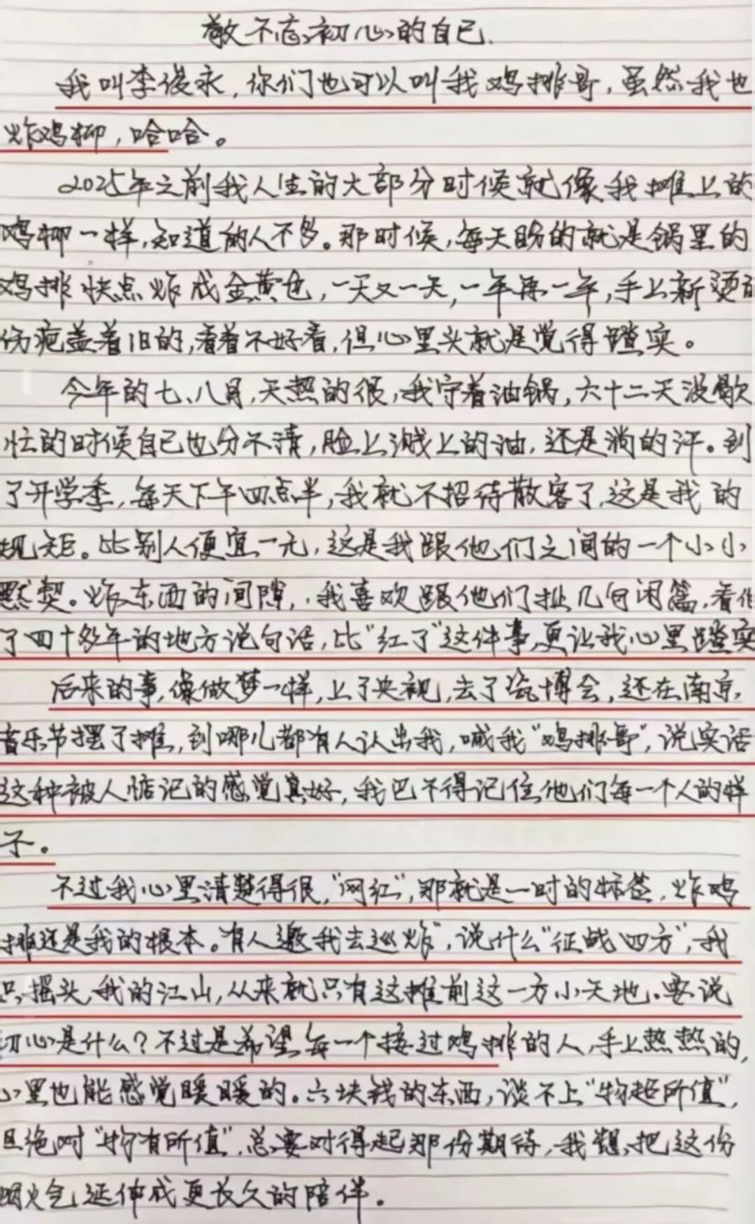 “鸡排哥”在油锅前写。他写日子就像摊上那些鸡柳,炸了一茬又一茬。他伸出手,虎口处新起的油泡,叠在昨天刚结痂的疤上。