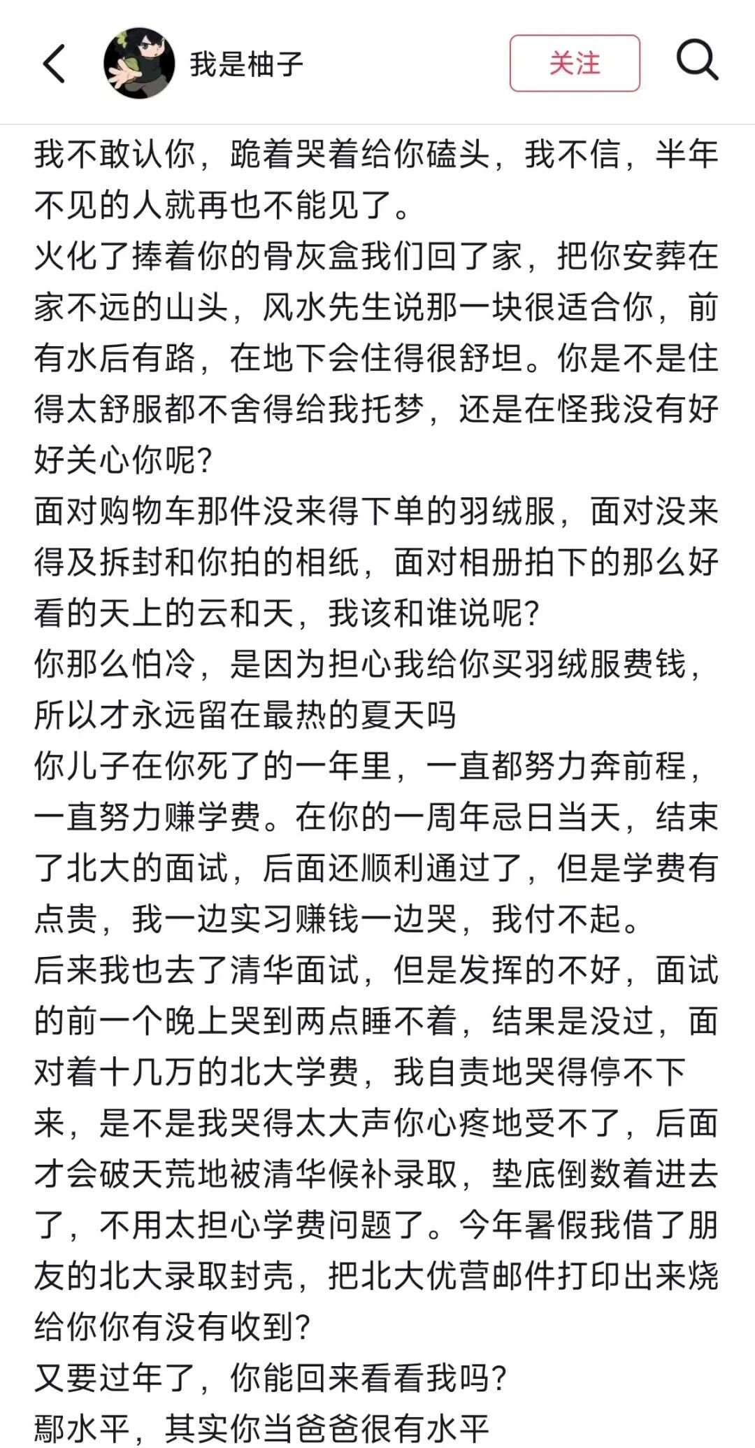 另一个年轻人鄢(yān)开耀,保送清华后,写了一篇长文给已经离世的父亲鄢水平。