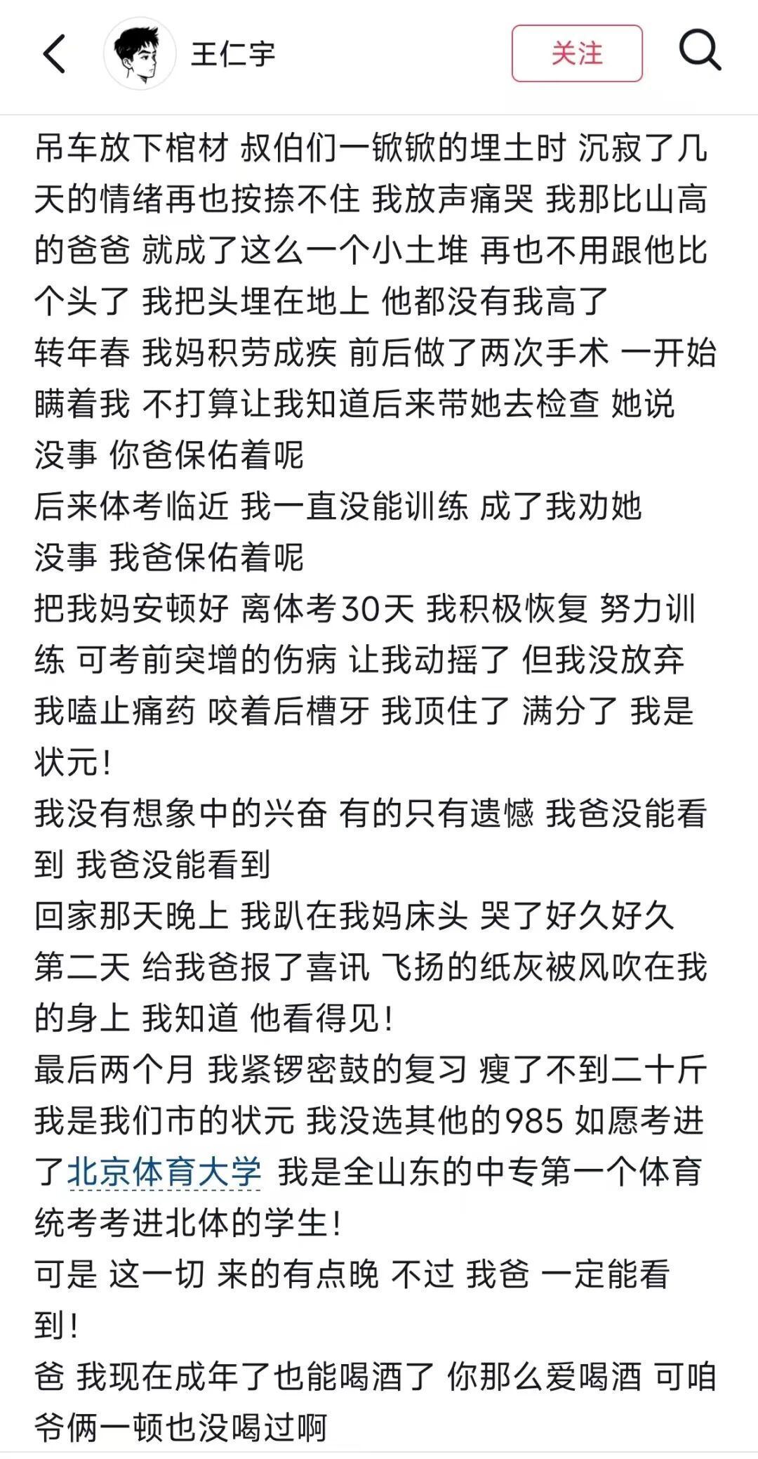 王仁宇,一个从中专一路考进北京体育大学的年轻人,他的作文里没有励志逆袭的豪言。