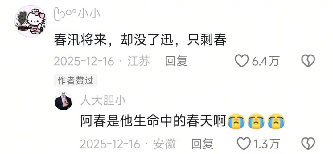 而他的文字,让359万陌生人与他一起哽咽。评论区里,有人说:“春汛将来,却没了迅,只剩春。”