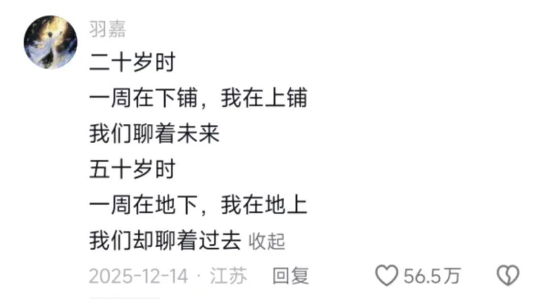 在张河清的评论区里,网友续写“二十岁时,一周在下铺,我在上铺,我们聊着未来;五十岁时,一周在地下,我在地上,我们却聊着过去”。
