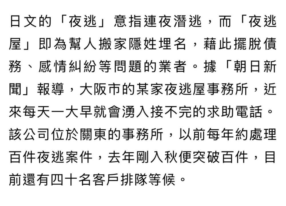 有需求就有市场,一个专门为了“帮助人完全消失的职业”就这样孕育而生,名曰“夜逃屋”。
