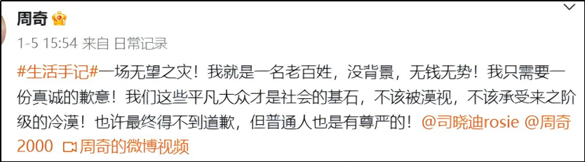 因为素人大叔一直喊话周奇、司晓迪向他道歉,网友看厌了,就觉得过分了。