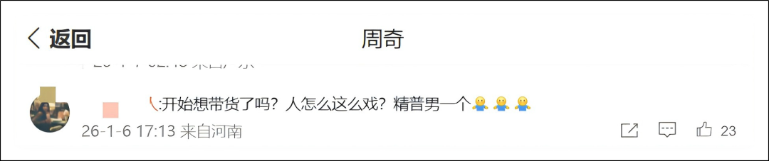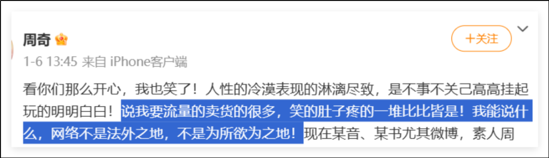 因为普通人会用抖音、视频号、小红书等APP,上面的网友不一定直接找到素人周奇的账号,但他们可以铺天盖地的发图文来嘲笑周奇、恶搞周奇。