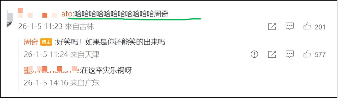 比如“哈哈哈哈哈哈哈哈哈周奇”,这句话在素人大叔看来是嘲讽。