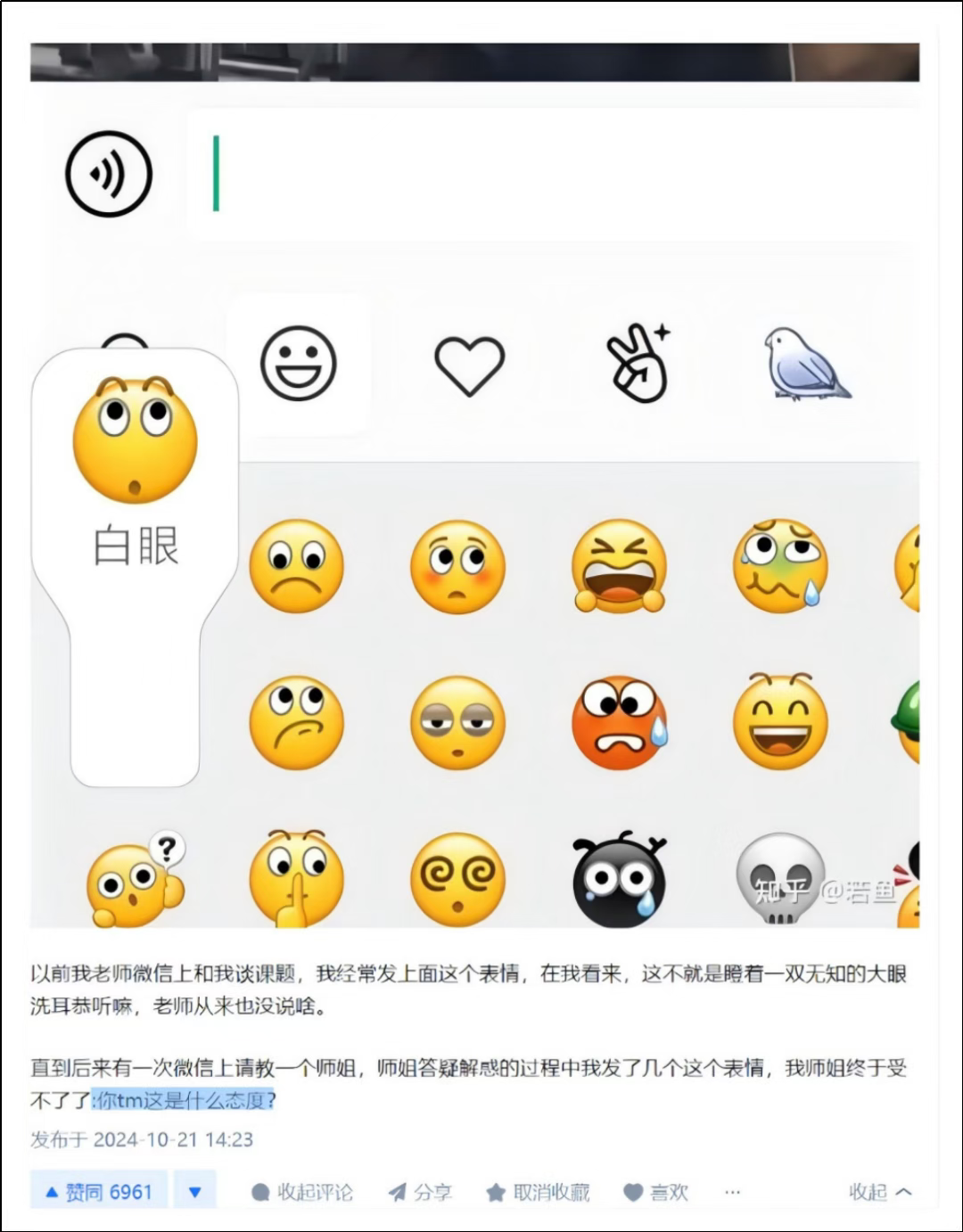 在这个可能不太贴近的例子里,网友用微表情来表达洗耳恭听,结果让人误以为是白眼挑衅。