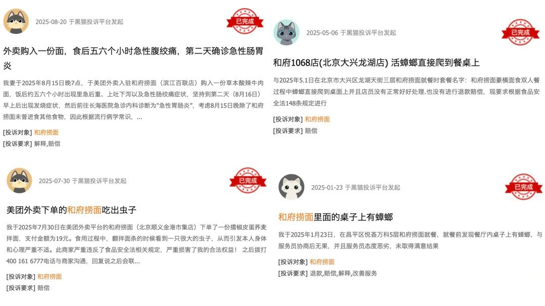 和府捞面在营销上不遗余力,却在产品品控和食品安全上多次翻车,黑猫投诉等三方平台,也常见针对和府捞面的投诉,比如餐厅出现老鼠,餐品中发现头发、水蒸蛋变质发酸等。